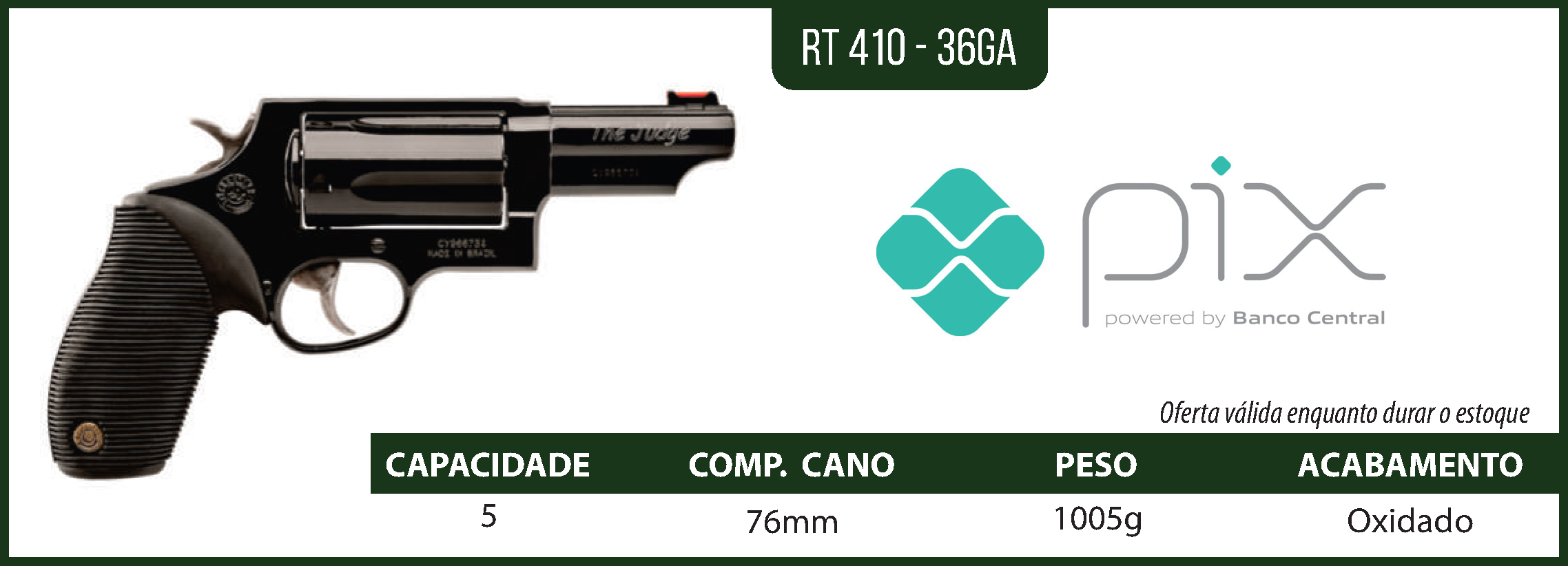 O Revólver Taurus RT 410 3” Carbono Alto Brilho é uma arma para atiradores que procuram um revólver preciso e compacto, possuindo vértice fixa e massa com fibra óptica. Com capacidade para 5 disparos no calibre 36GA, é produzido em carbono de alto brilho, possuindo cano com 3” e comprimento total de 234 mm, sendo um revólver muito compacto.